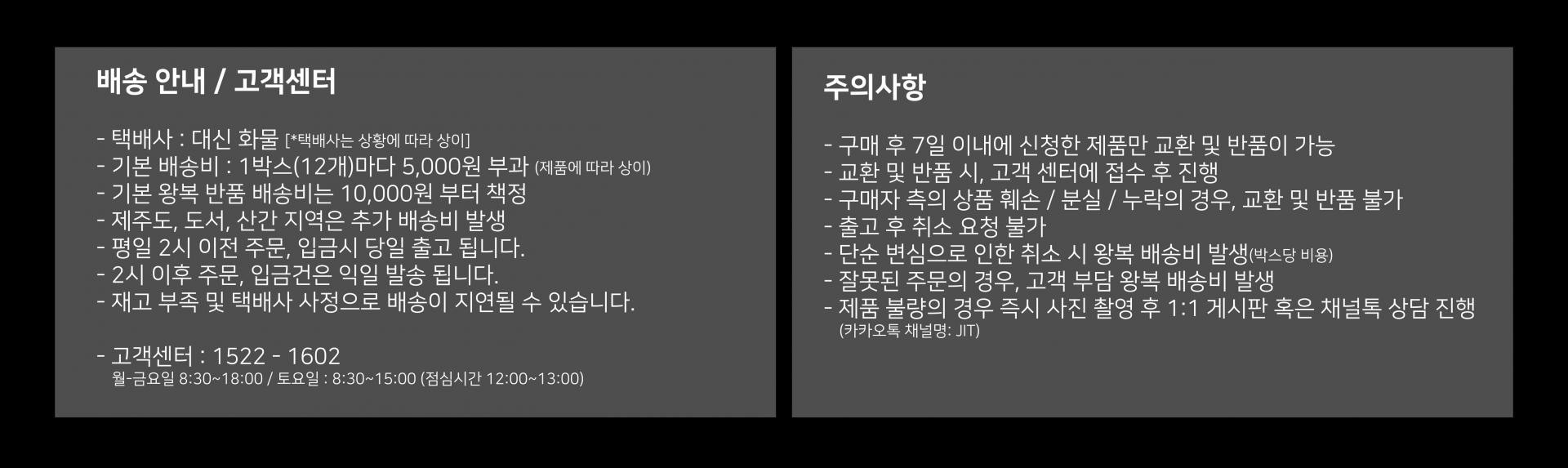 상품별/지역별마다 배송비용이 상이하므로, 자세한 문의는 카카오톡 채널 'JIT' 로 문의바랍니다. (정인텍/대신화물택배)